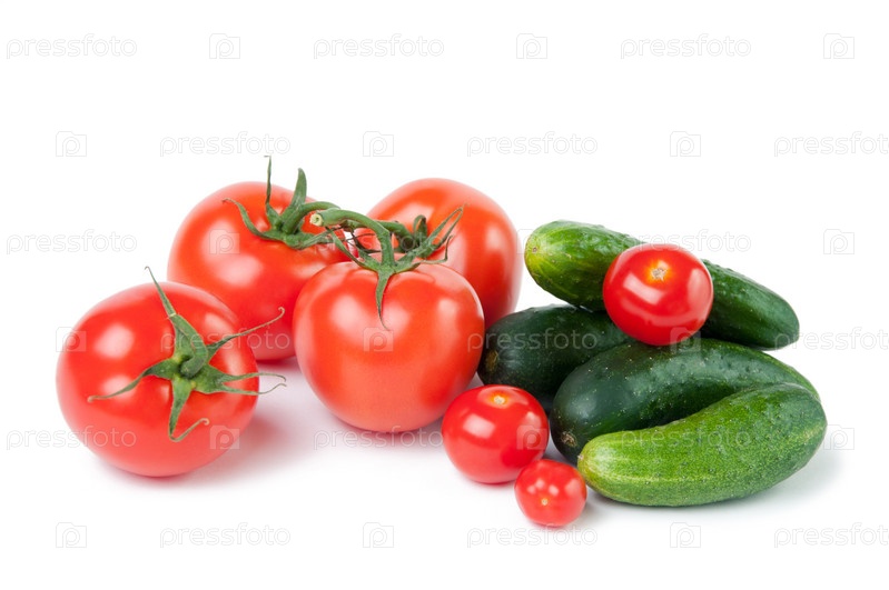 Спелые помидоры и огурцы крупным планом на белом фоне