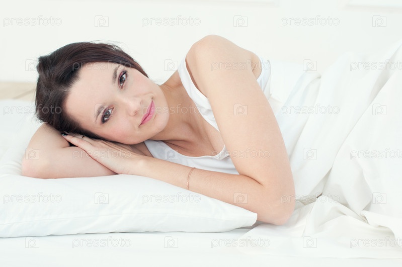 Привлекательная молодая женщина лежит в постели и смотрит в камеру
