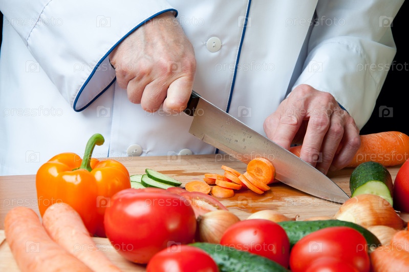 Шеф-повар режет морковь, студийная съемка