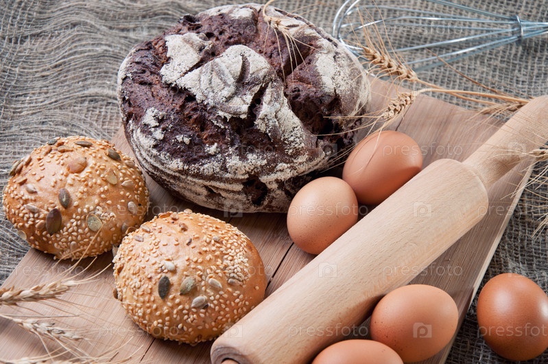 Свежий хлеб, куриные яйца и кухонные принадлежности