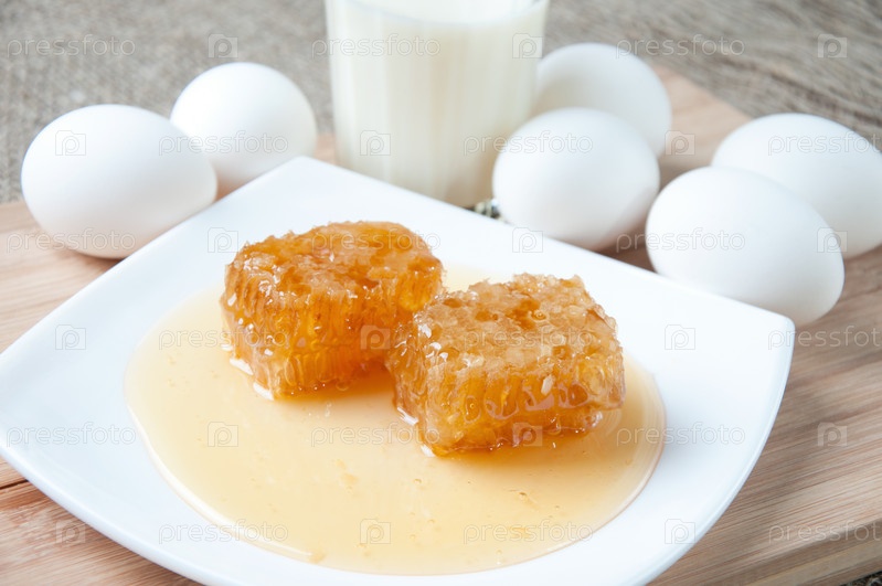 Свежий мед и соты, яйца и стакан молока
