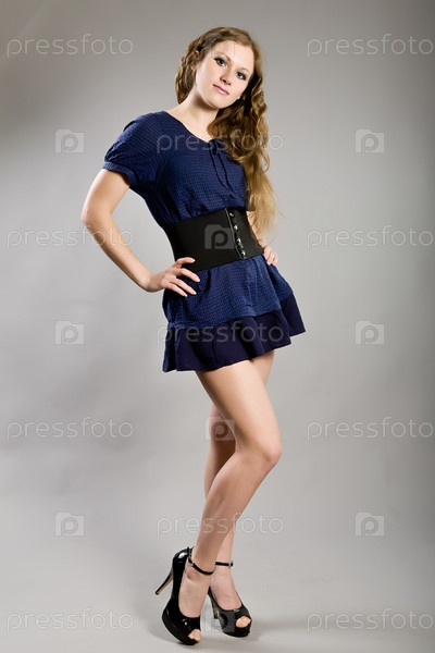 Привлекательная девушка в синем платье на сером фоне