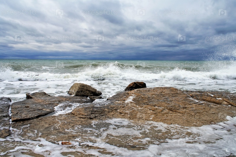 Бурные волны на скалистом океанском побережье и пасмурное небо