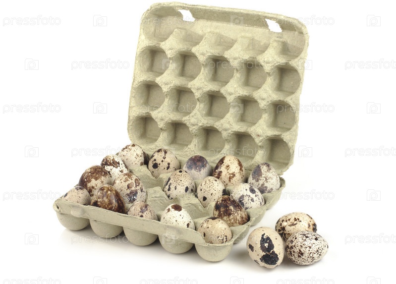 Перепелиные яйца в коробке на белом фоне