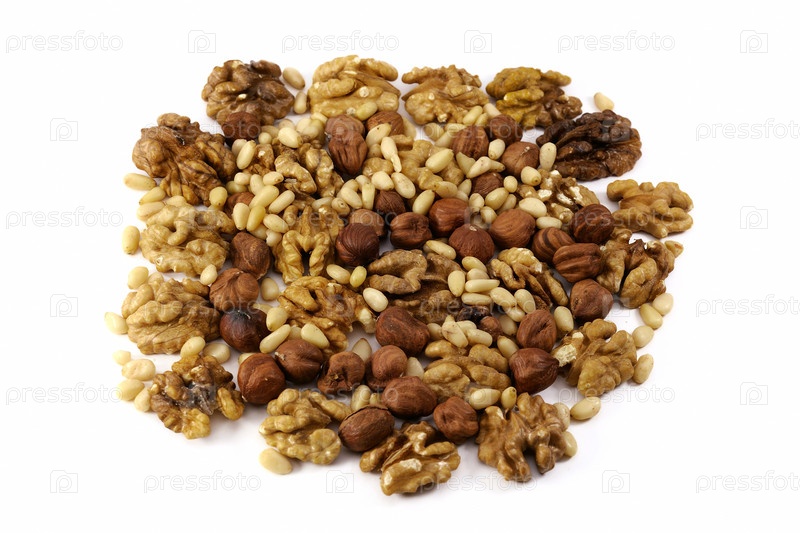 Орехи: фундук, грецкий орех, кедр, изолированные на белом фоне