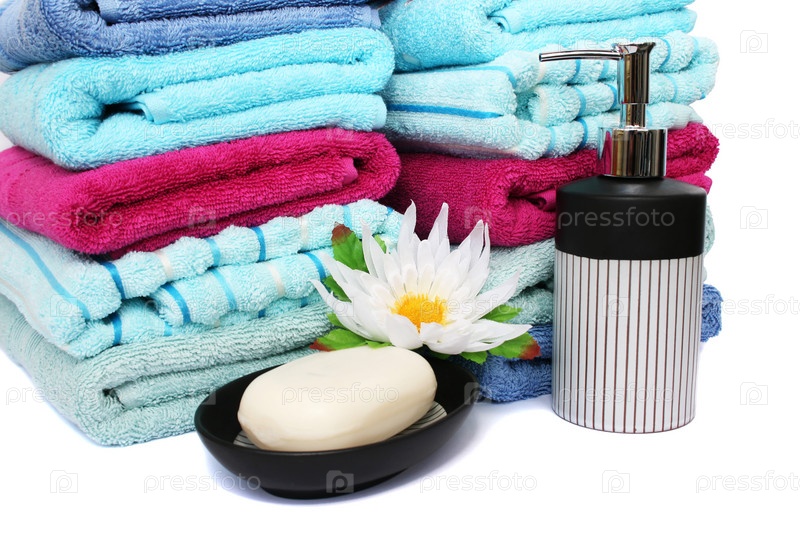 Красочные полотенца,мыло и цветы изолированы на белом фоне