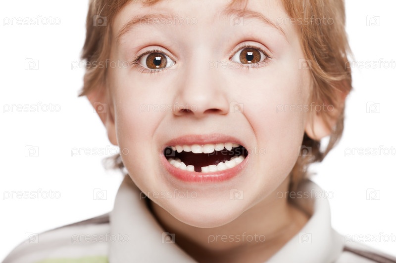 Улыбающийся мальчик показывает первый выпавший молочный зуб в открытый рот