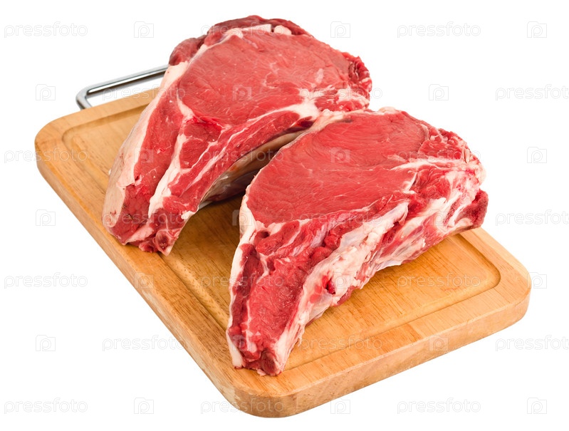 Сырое мясо на деревянной доске, изолированное на белом фоне