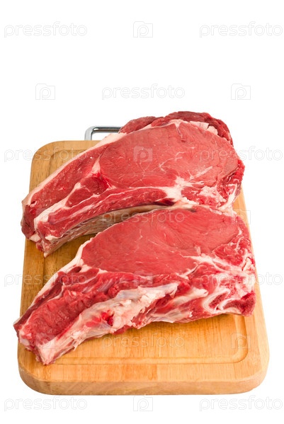 Сырое мясо на деревянной доске, изолированное на белом фоне