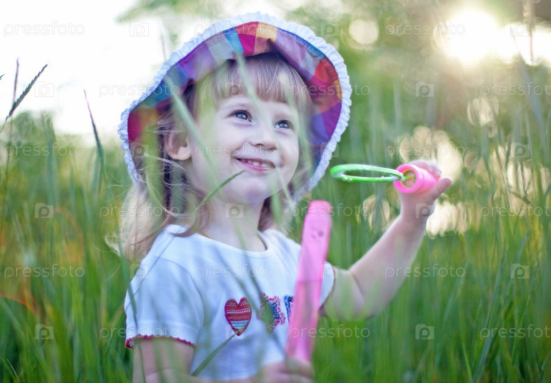 Маленькая девочка пускает мыльные пузыри в зеленой траве