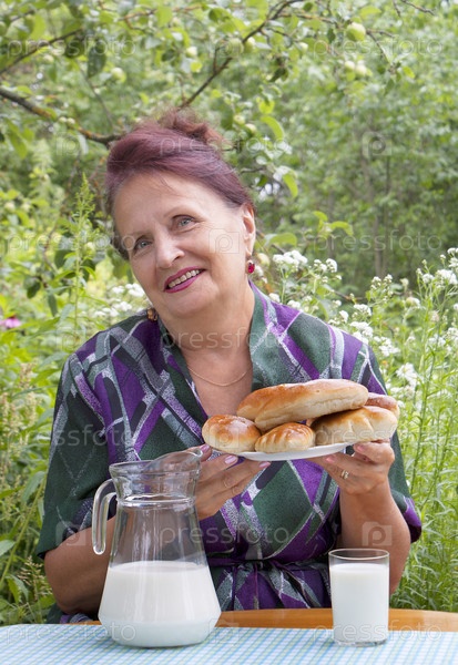 Счастливая улыбающаяся женщина пьет парное молоко с румяными пирогами