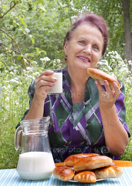 Счастливая улыбающаяся женщина пьет парное молоко с румяными пирогами