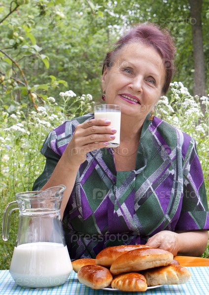 Счастливая улыбающаяся женщина пьет парное молоко с румяными пирогами