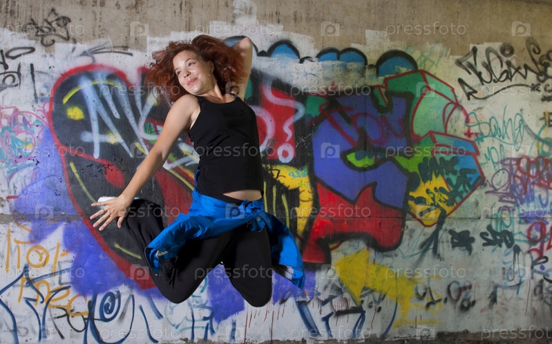 Молодая женщина прыгает на фоне городской стены