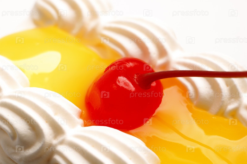 Кусок лимонного торта с желе и вишней на белом фоне
