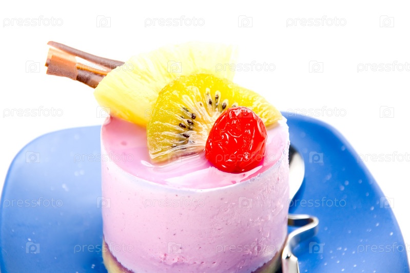 Кусок торта со свежими фруктами на белом фоне