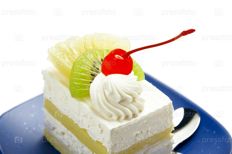 Кусок торта со свежими фруктами на белом фоне