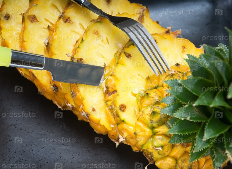 Ананас с ножом и вилкой на черной тарелке, изолированный на белом фоне