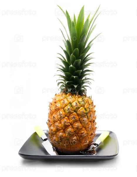 Ананас с ножом и вилкой на черной тарелке