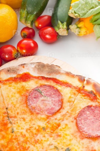 Итальянская оригинальная тонкая пицца пепперони со свежими овощами на заднем плане