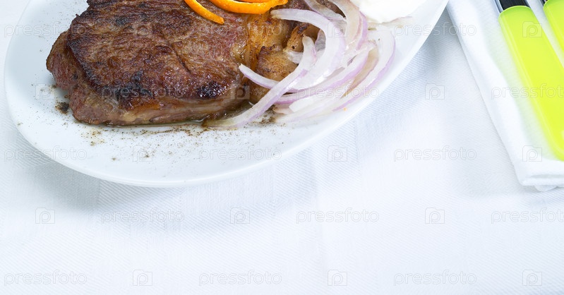 Нарезанный сочный жареный бифштекс с апельсиновой и лимонной цедрой и овощами