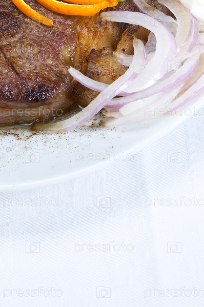 Нарезанные сочный жареный бифштекс с апельсиновой и лимонной цедрой и овощами