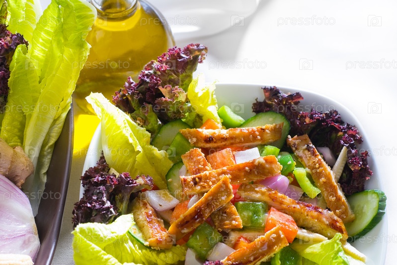 Яркий свежий куриный салат сезам крупным планом