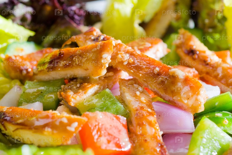Яркий свежий куриный салат сезам крупным планом