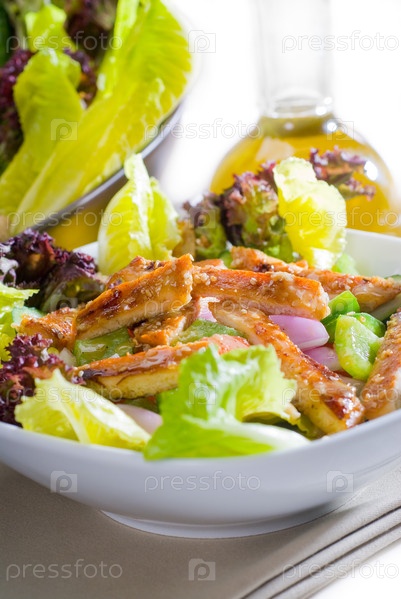 Яркий свежий куриный салат сезам крупным планом
