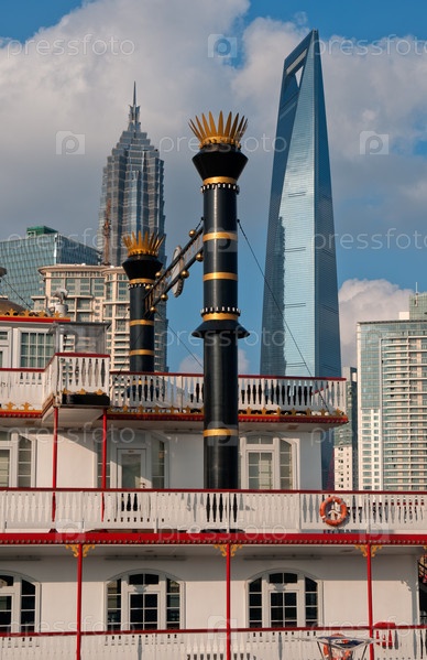 Шанхай, район Пудун, вид из Бунд Пуси в солнечный день с большим параходом на переднем плане
