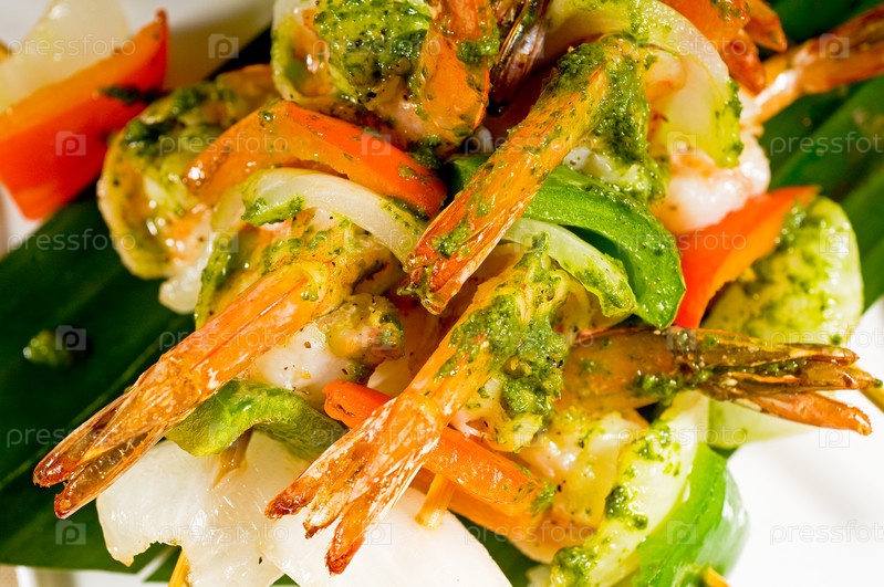 Свежие яркие жареные овощи и креветки на шампурах на пальмовых листьях в тайском стиле