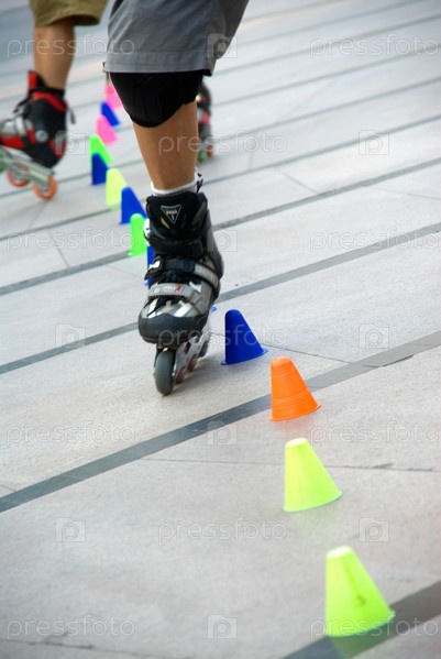 Парень катается на роликах между яркими конусами