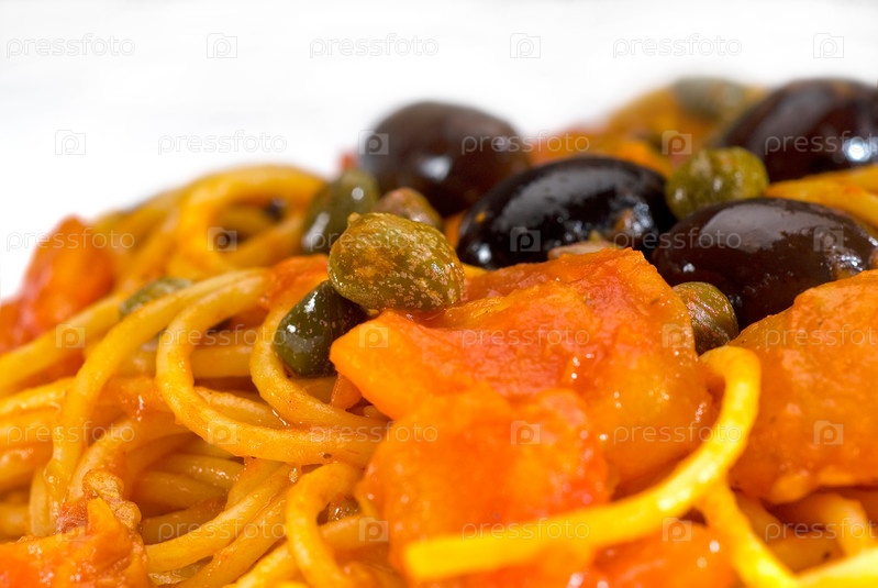 Итальянские макароны спагетти со свежим домашним соусом путтанеска крупным планом