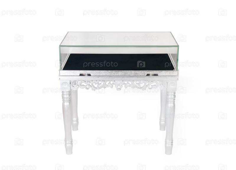 Серебряный выставочный стол, изолированный на белом фоне
