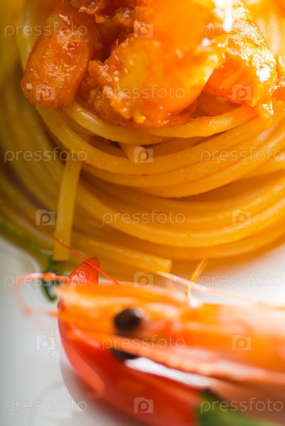 Итальянские спагетти и свежие креветки с пряным соусом на белой тарелке