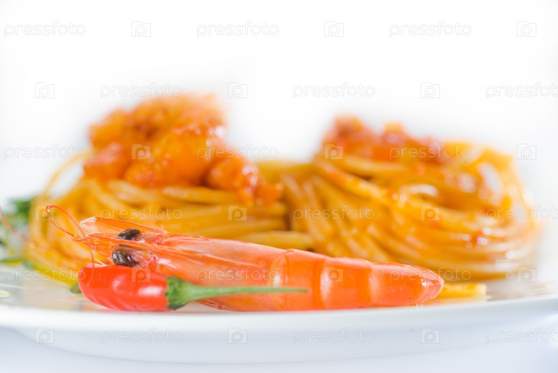 Итальянские спагетти и свежие креветки с пряным соусом на белой тарелке