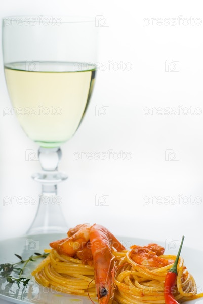 Итальянские спагетти и свежие креветки с пряным соусом на белой тарелке
