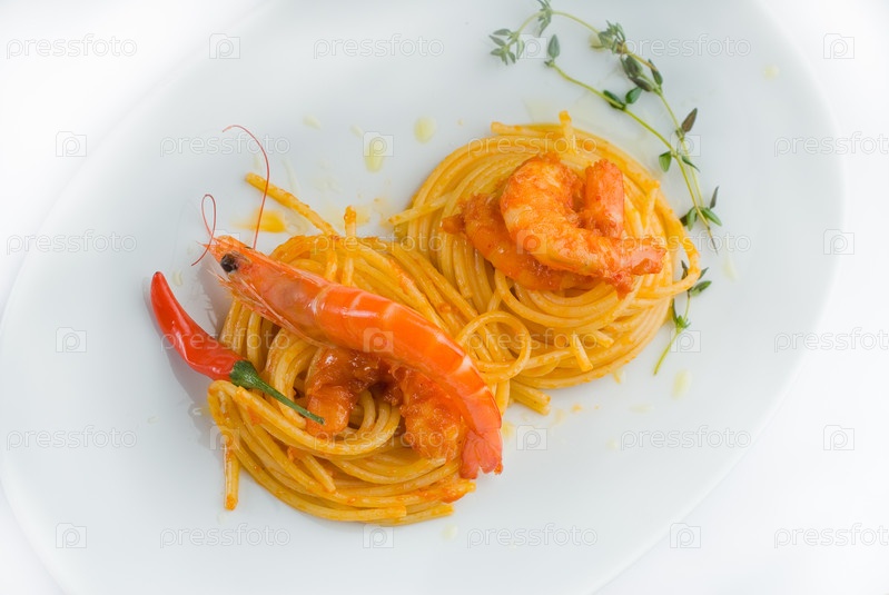 Итальянские спагетти и свежие креветки с пряным соусом на белой тарелке