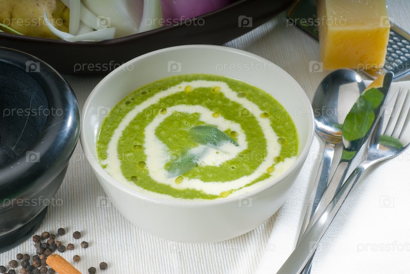 Свежий суп со шпинатом, шалфеем и сливками в белой миске