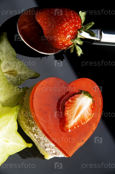 Клубничное пирожное в форме сердца со звездами карамболы на черном фоне