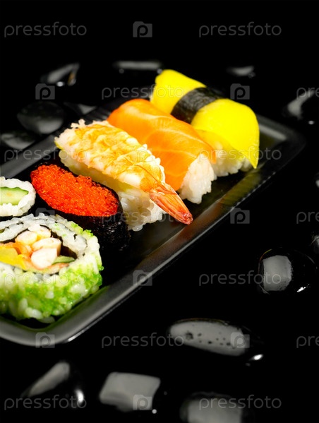 Тарелка с набором суши на черном фоне