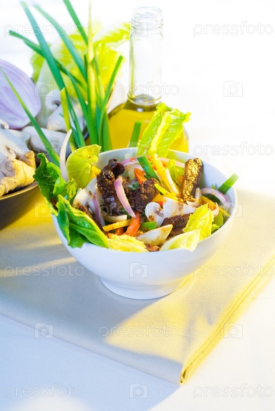 Свежий яркий тайский салат на тарелке крупным планом