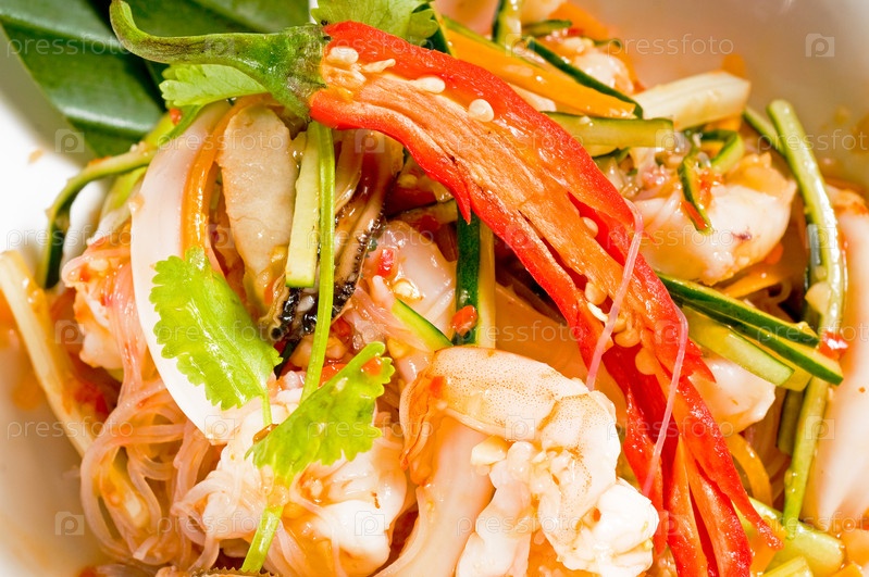 Свежий тайский салат с морепродуктами и лапшой в стеклянной миске крупным планом