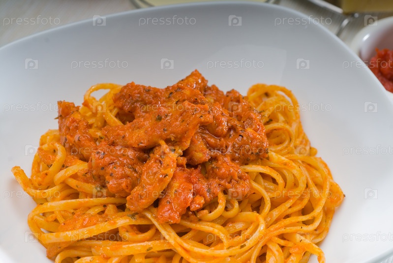Итальянские спагетти со свежим домашним соусов из помидоров и курицы