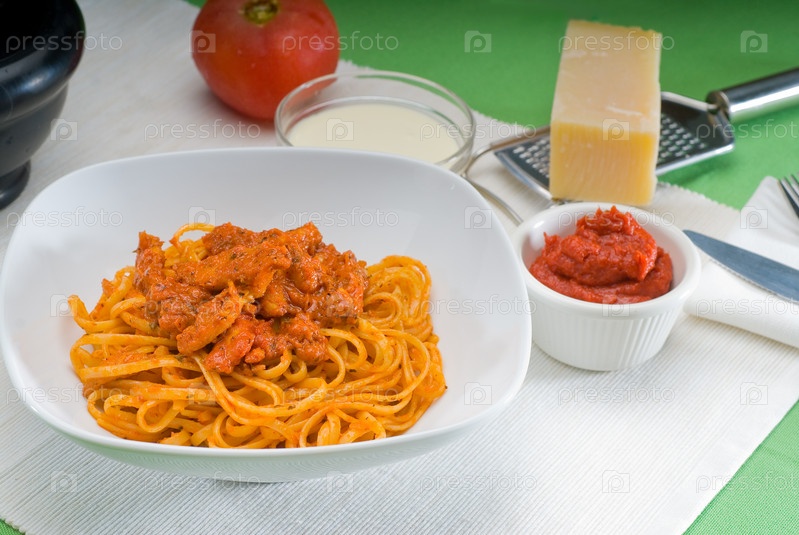 Итальянские спагетти со свежим домашним соусов из помидоров и курицы