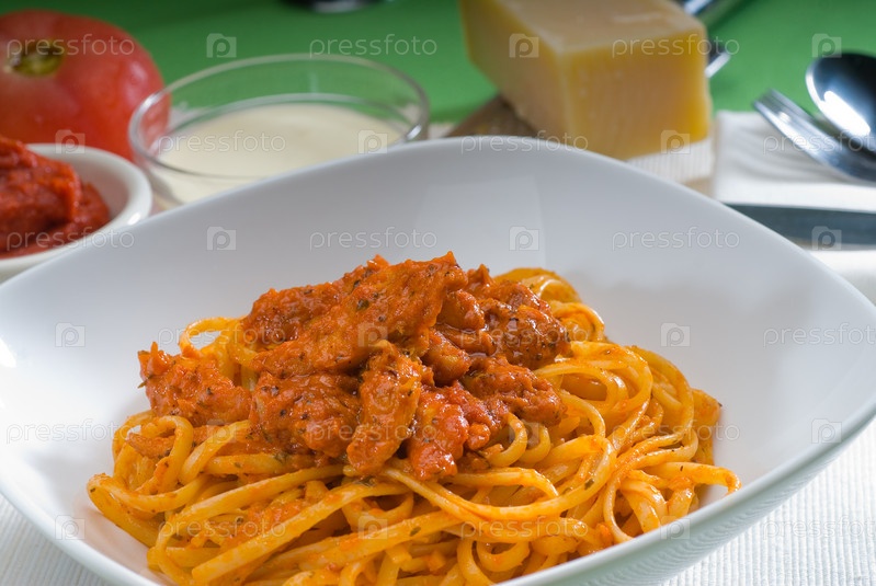 Итальянские спагетти со свежим домашним соусов из помидоров и курицы