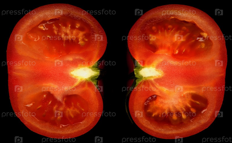 Спелый разрезанный пополам помидор на черном фоне