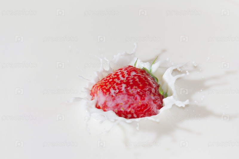 Свежая клубника падает в молоко со всплеском крупным планом