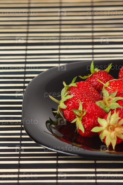 Черное блюдо со спелой свежей клубникой на бамбуковом столе