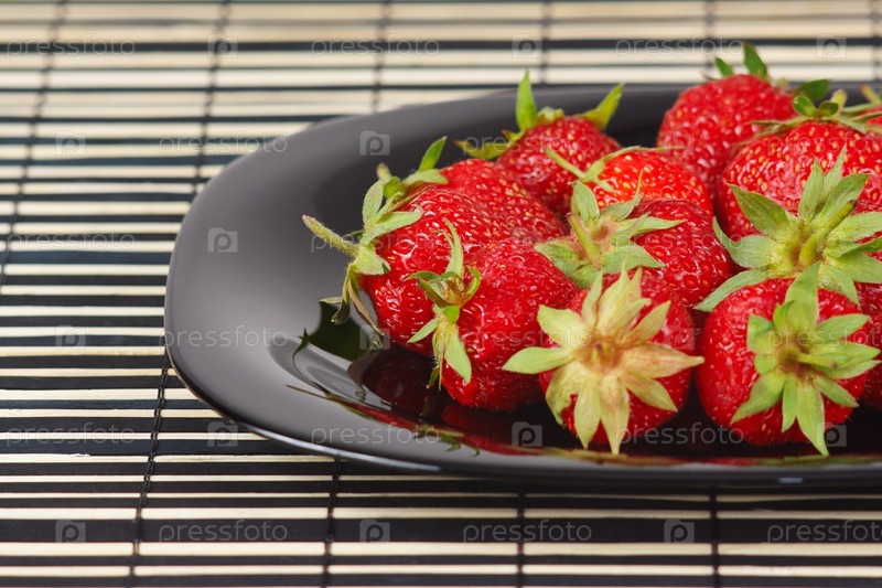 Черное блюдо со спелой свежей клубникой на бамбуковом столе